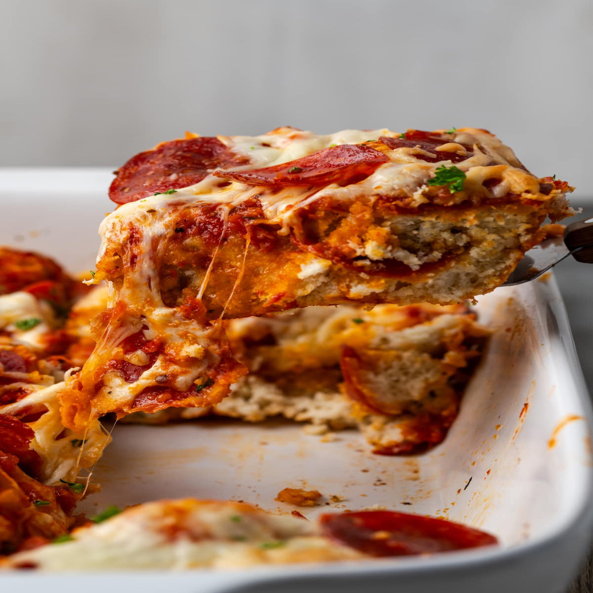Italian Pepperoni Pizza Casserole over zucchini topped w/ Italian marinara and 3-cheeses