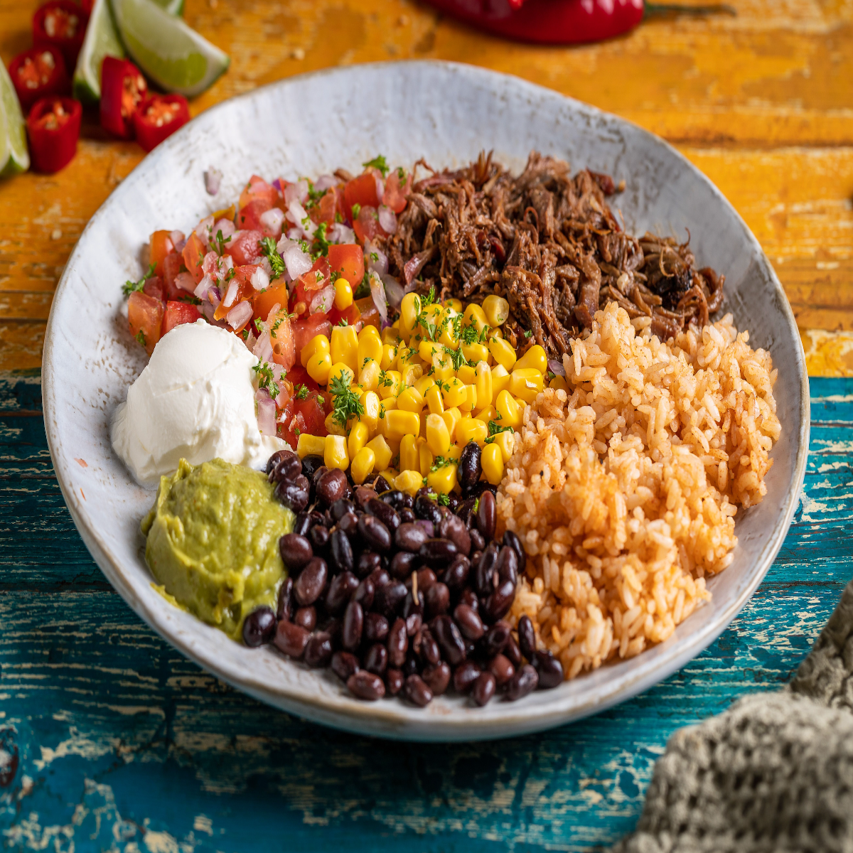 Beef & Bean Burrito Bowl with corn and pico de gallo